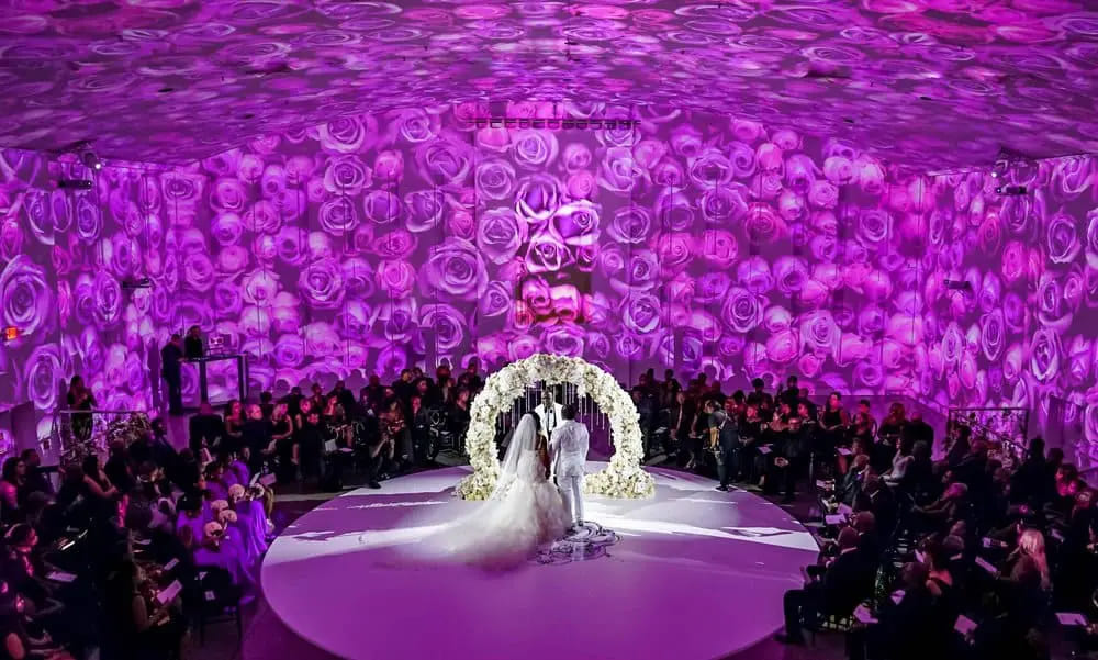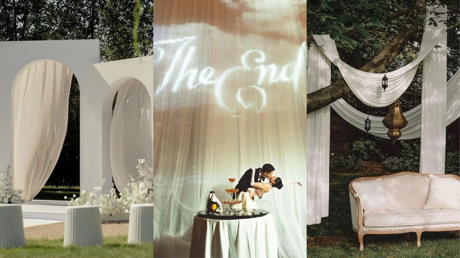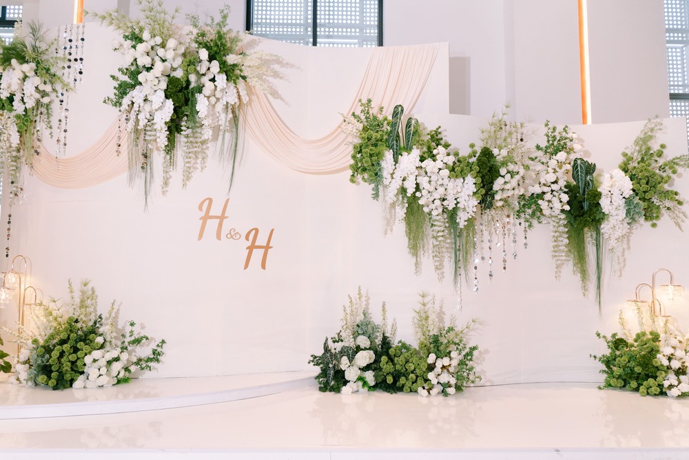 Một trong những bước tiến lớn nhất là việc sử dụng công nghệ trình chiếu Mapping trực tiếp lên các mảng rèm lụa (floor-to-ceiling drapes) hoặc tường hoa trắng. Bề mặt vải mềm mại giúp tán xạ ánh sáng, khiến những hình ảnh kỹ thuật số như cánh hoa rơi, mặt nước dập dềnh hay những thước phim kỷ niệm trở nên chân thực và đậm chất điện ảnh hơn.